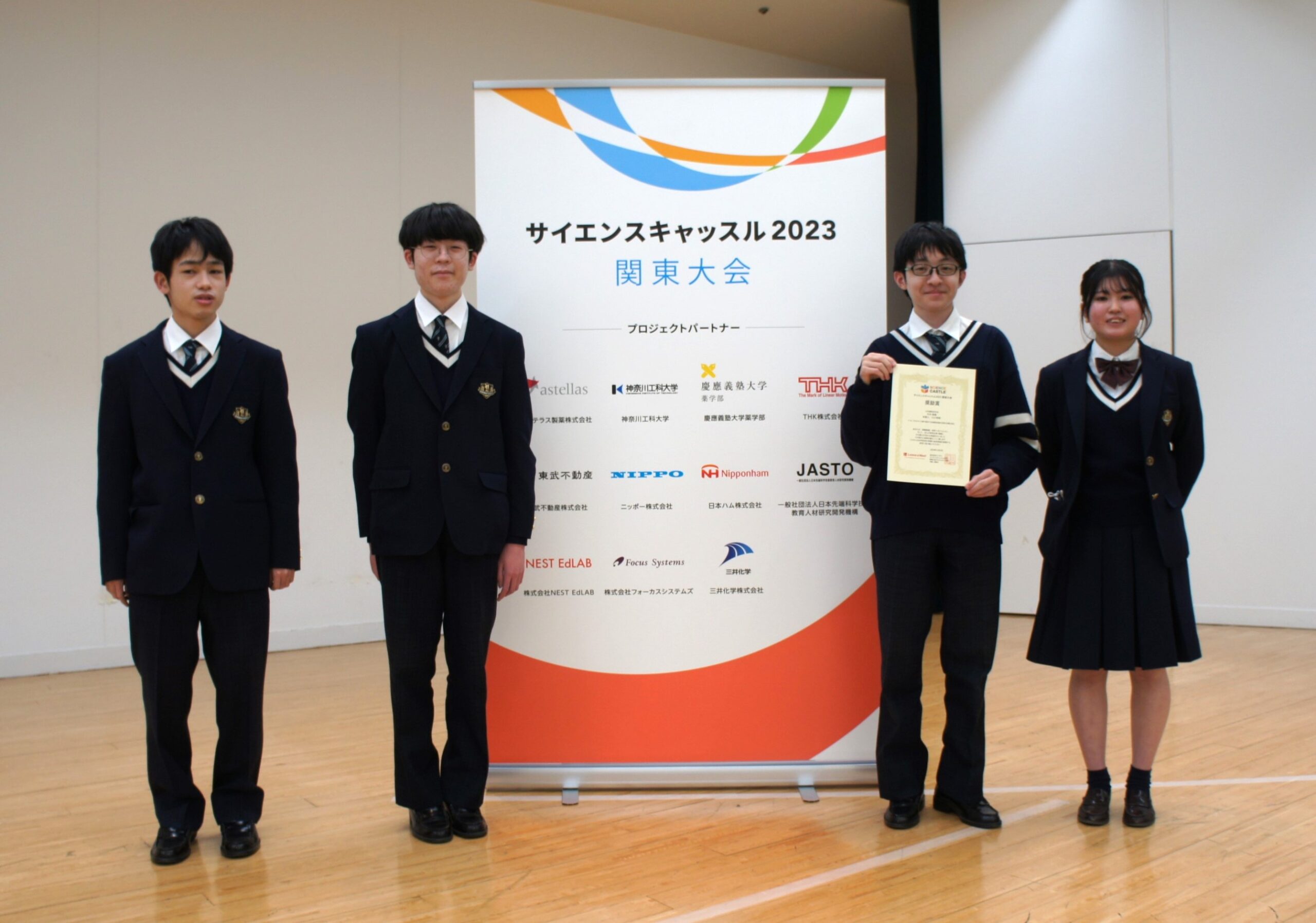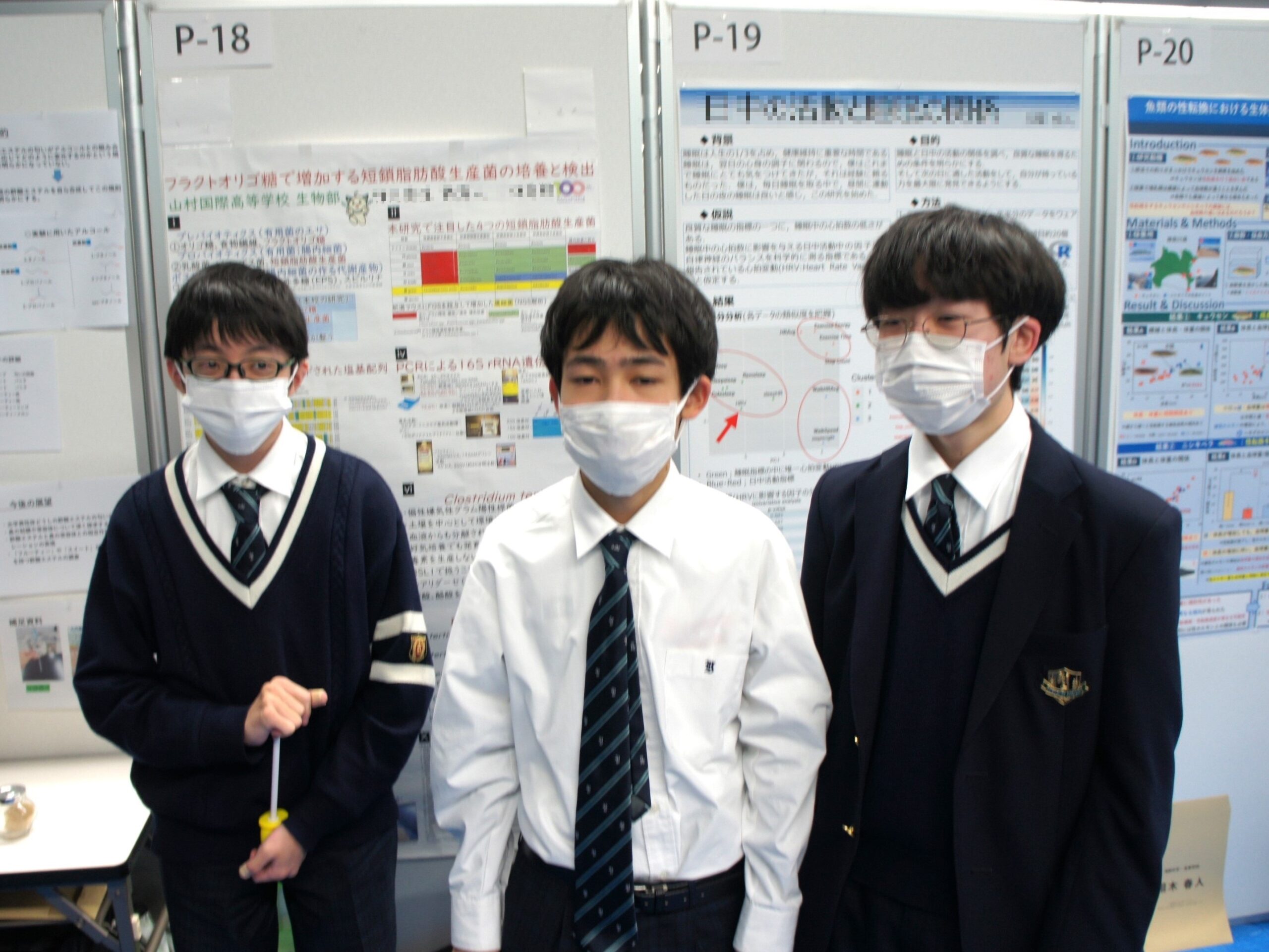 本校生物部は、今回オーラルプレゼンテーション(1件)、英語ポスターセッション(1件)および日本語ポスターセッション(2件)にエントリーしておりましたが、オーラルは日本語に変更がなされ英語と日本語での発表に臨みました。英語ポスターセッションは、審査員には大変好印象でしたが入賞は逃してしまいました。しかし、松本君の「洗口液の歯周病菌におよぼす殺菌効果」が、248件もの日本語ポスターセッションの中から見事に「第1位」に選ばれました(本校は昨年に引き続き2回目の第1位です)。23日は寒の戻りで大変寒い日ではありましたが、「つくば国際会議場」の表彰式は、受賞を称える熱い拍手に包まれていました。ありがとうございました。