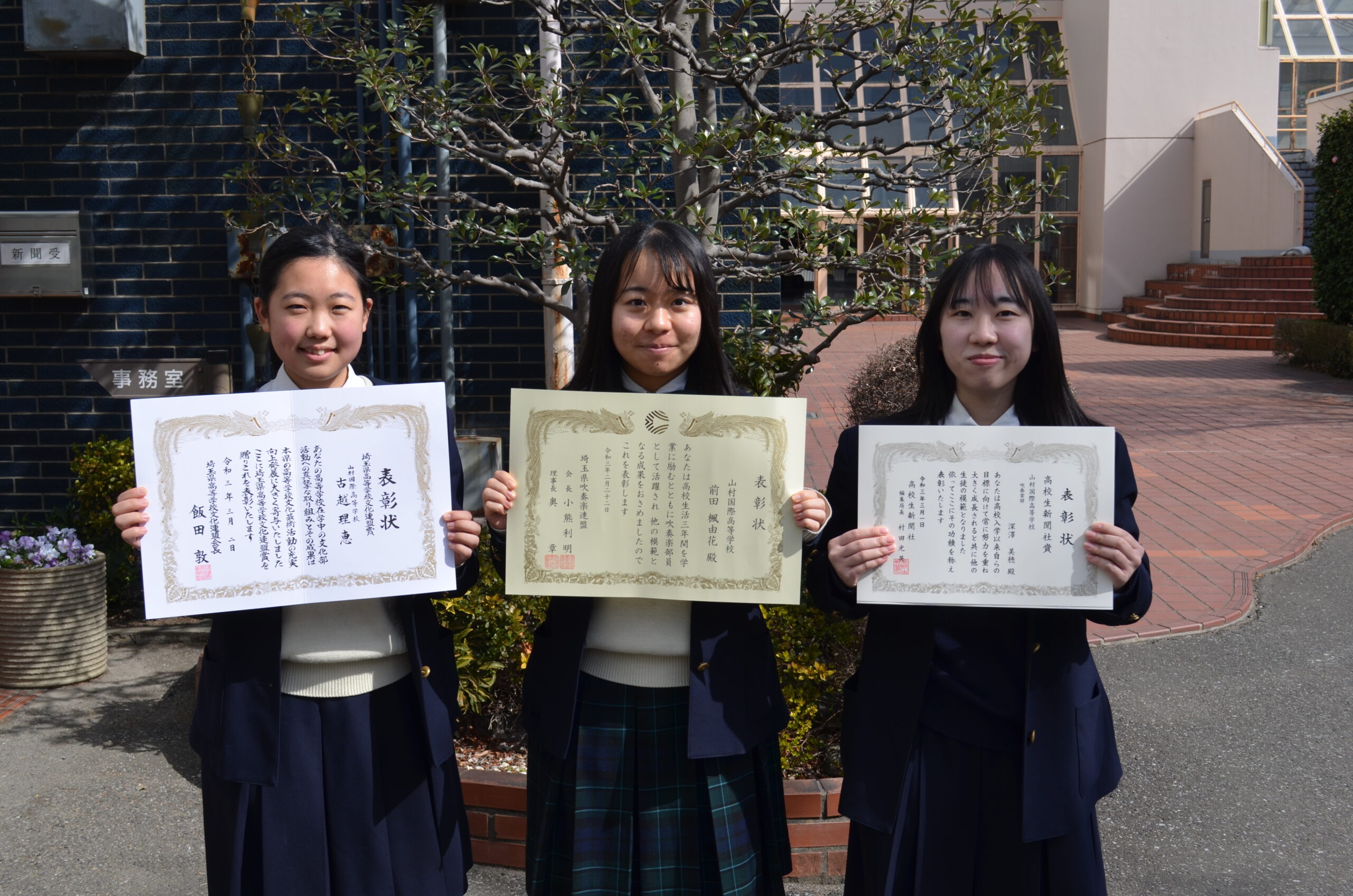 右から、高校生新聞社賞(代表・深澤美穂(3年)) 埼玉県吹奏楽連盟優良生徒表彰(前田楓由花(3年)) 埼玉県高等学校文化連盟賞(古越理恵(3年))