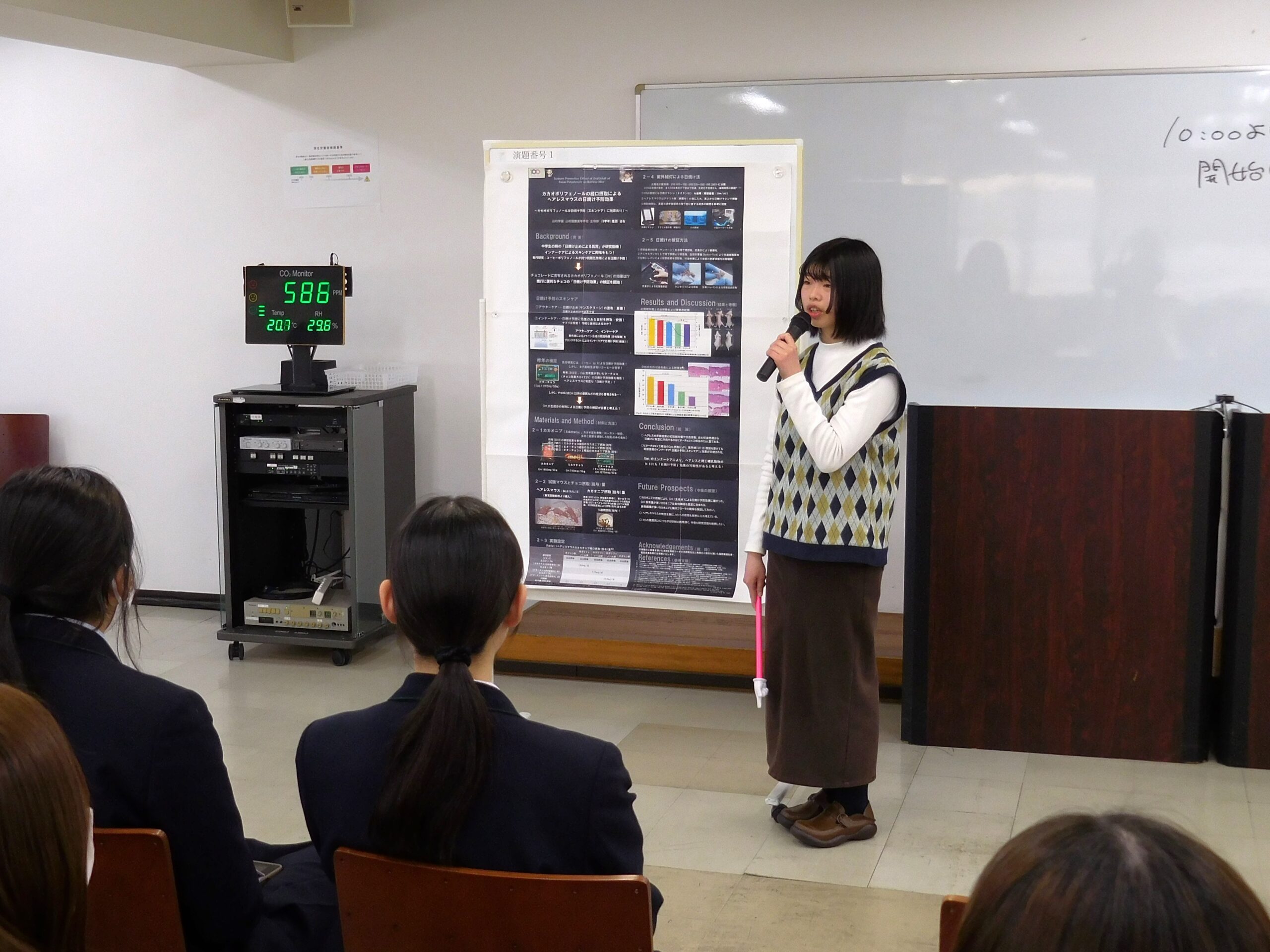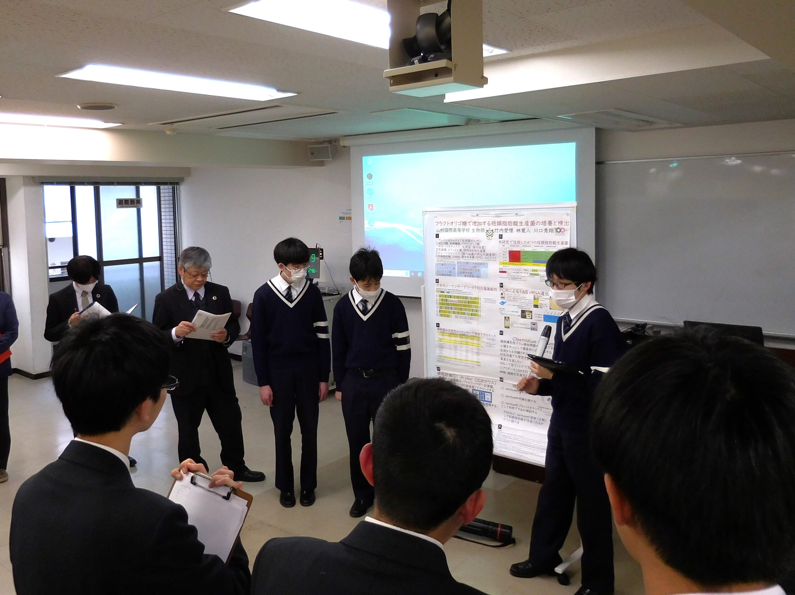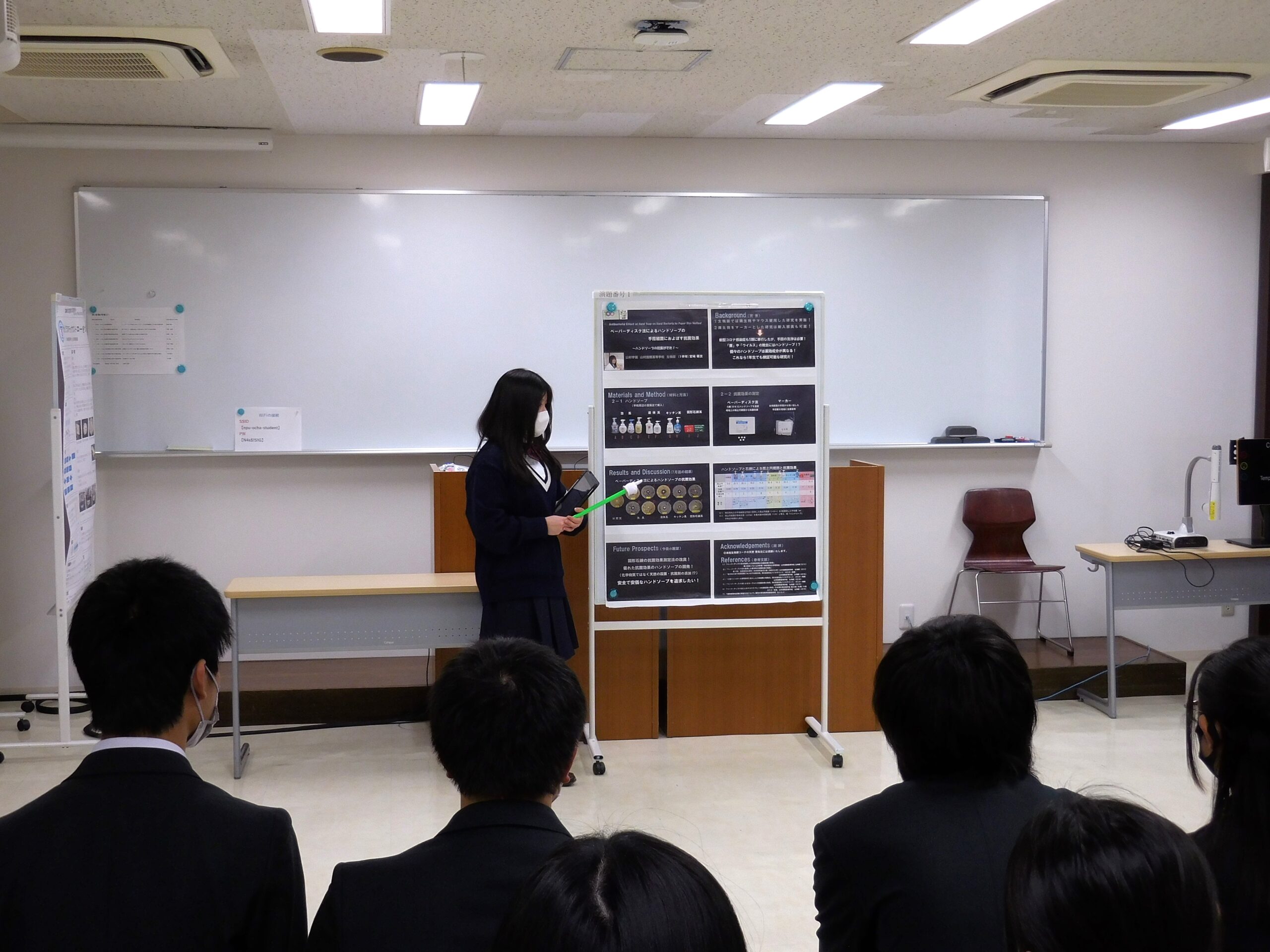 当日は10時から開催され、生物部の演題を含めた34演題が4会場に分かれ、他校の生徒を前に、順番に1演題ずつの発表となりました。全員を前にした順番の発表でしたので、従来のポスター発表では得られない各校の様子が比較できるなど、今後の参考にすることができました(受賞は後日の連絡*)。ありがとうございました。
