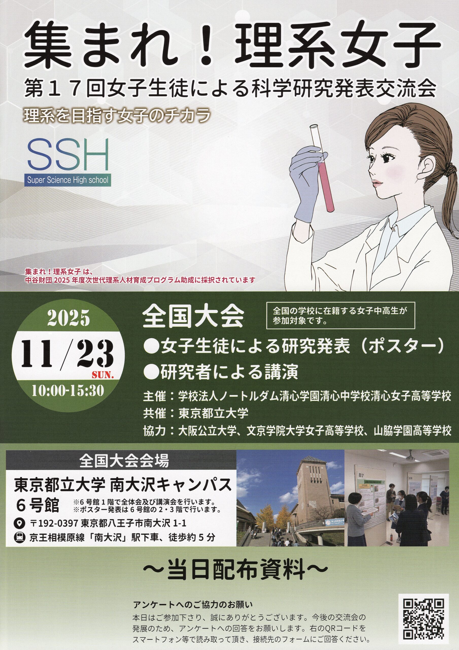 *:「集まれ!理系女子」:岡山県にあるノートルダム清心学園 清心中学・女子高校(SSH)により主催され、日頃の課題研究の発表交流会を通して、理系に進学希望をもつ女子生徒のネットワークを拡げるなど、理系の進学支援を目的としている。また女子学生・女子院生による研究発表や、大学と連携した女性研究者による講演会も同時に催され、女子中高生への理系進学のロールモデルを提供している。