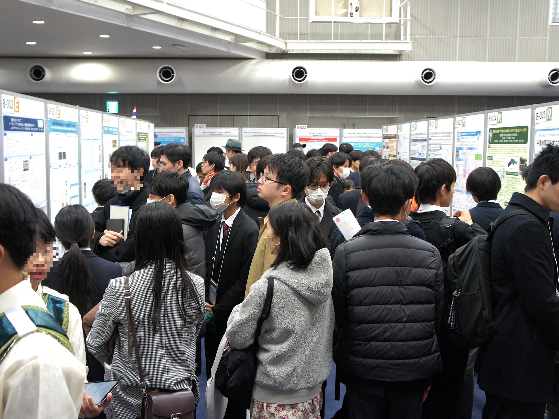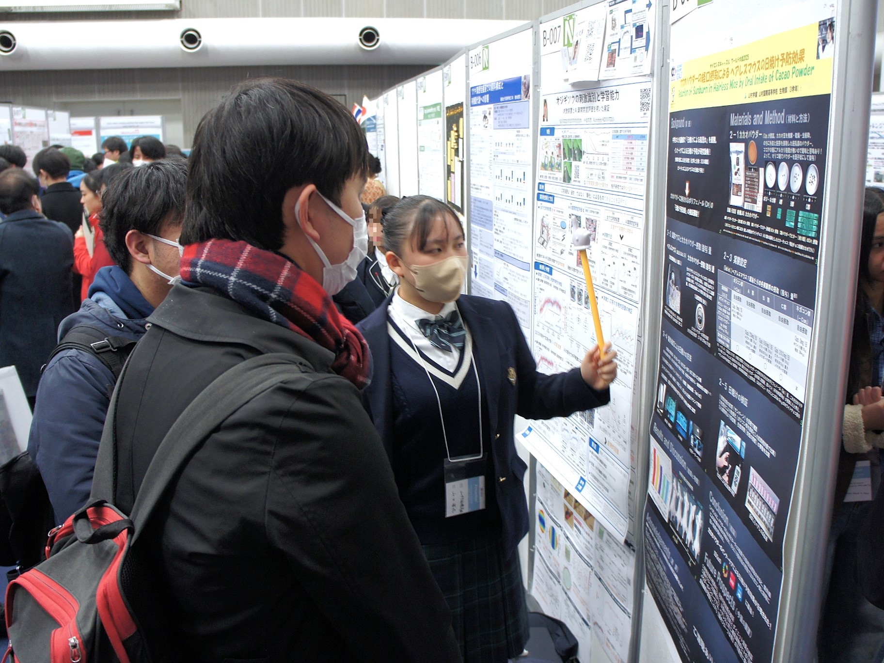 受賞した3年生の演題「カカオパウダーの経口摂取によるヘアレスマウスの日焼け予防効果」は、事前審査を受け13日の選抜ポスター発表に選出され、また1年生の演題も事前審査を受け、翌14日に催されましたポスター大交流会に選出されました。